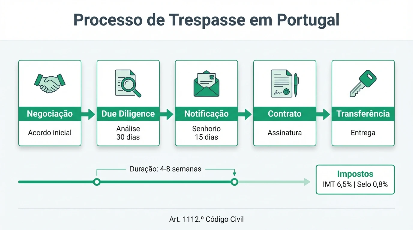 O trespasse é a transmissão definitiva da propriedade de um estabelecimento comercial ou industrial, incluindo todos os elementos (bens, clientela, licenças, contratos). Está regulado pelo artigo 1112.º do Código Civil e não requer escritura pública - basta contrato escrito. O senhorio deve ser notificado com 15 dias de antecedência e tem direito de preferência.